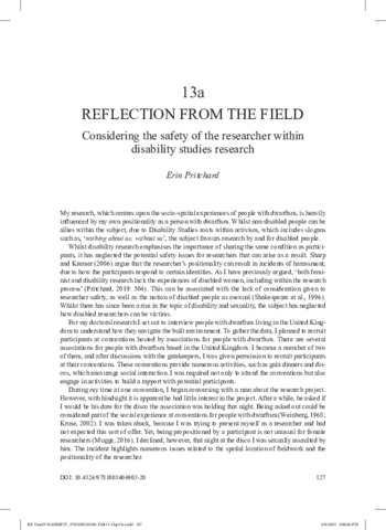 Pritchard, Erin (2025) Reflection from the field: Considering the safety of the researcher within disability studies research. In: Routledge Handbook of Field Research. Routledge, Abingdon. ISBN 9781032520186 (Accepted for Publication)